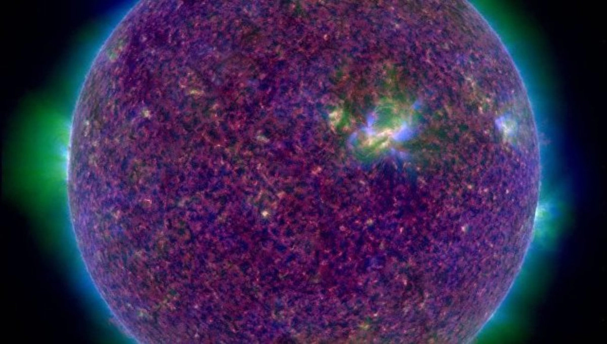 При съемке был использован экстремальный ультрафиолетовый свет с различной длиной волны. Именно благодаря этому Солнце на фотографии приобрело фиолетовый цвет.