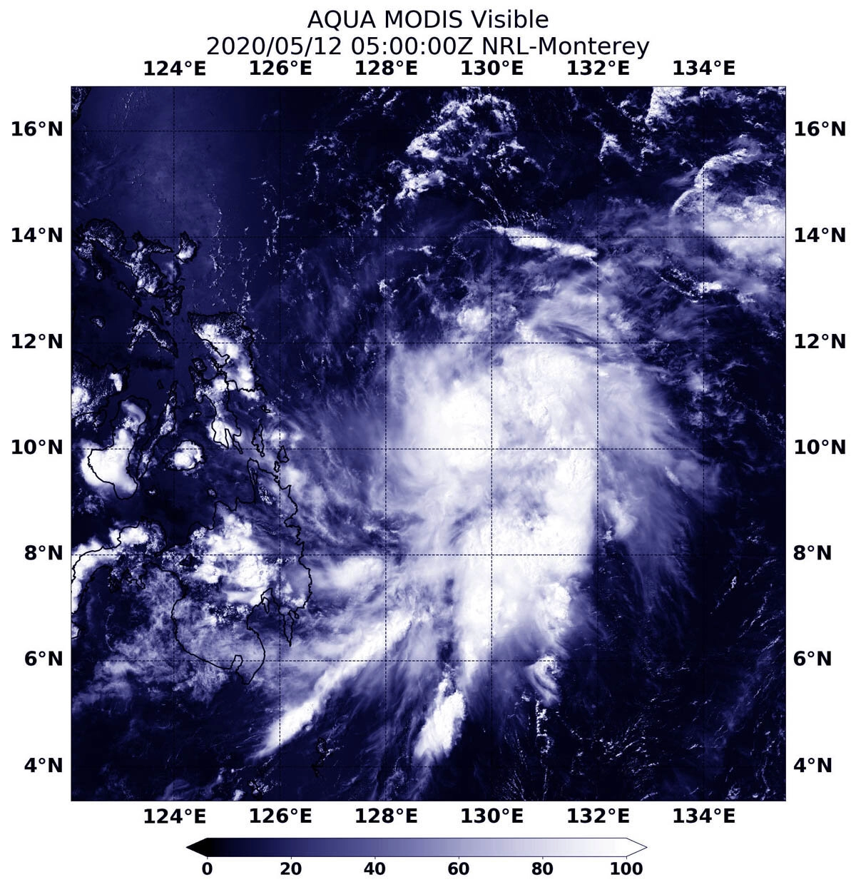 Вчера, 12 мая, спектрорадиометр MODIS, который установлен на борту спутника Aqua, предоставил изображение в хорошем качестве, на котором можно разглядеть «Вонфон». Данные говорят о том, что шторм приобрел более округлую форму, чем это было накануне, поскольку он продолжает консолидироваться.