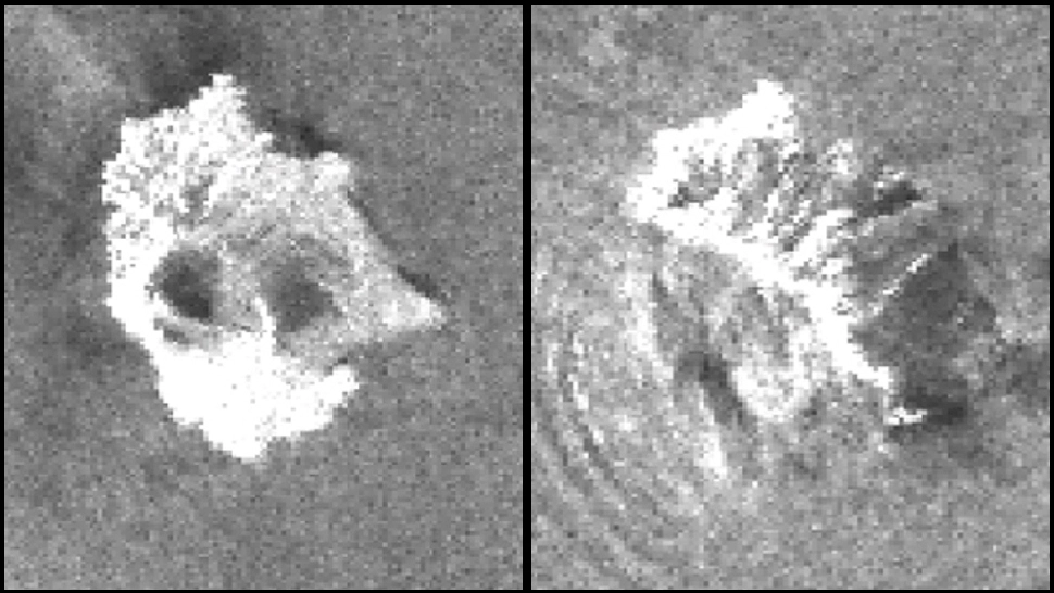 NASA разместило две фотографии — одна до извержения — 20 декабря 2018 года, другая уже после — 24 декабря 2018 года. Ученые пояснили, что во время самого извержения спутник не мог сделать качественный снимок из-за плотного облака пепла.