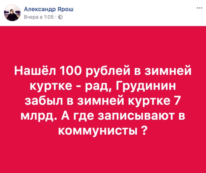 «То, что от Компартии в президенты идет миллиардер, на полном серьезе утверждающий, что он заработал миллиарды рублей на торговле земляникой и прочим сельским хозяйством, — само по себе прекрасно. Однако факт „забывчивости“ насчет иностранных ценных бумаг столь внушительной стоимости прекрасен вдвойне», — пишет, в свою очередь, публицист Александр Ярош в Facebook.
