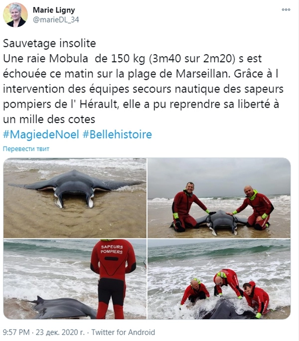 «Незабываемый момент для наших дайверов. Счастливый случай в этот трудный период. Такие примеры заботы об окружающей среде придают смысл жизни. Это спасение — несомненно, очень красивая рождественская история! Тем более что этот вид редко встречается на местных пляжах», — заявили в пожарно-спасательной службе департамента Эро.