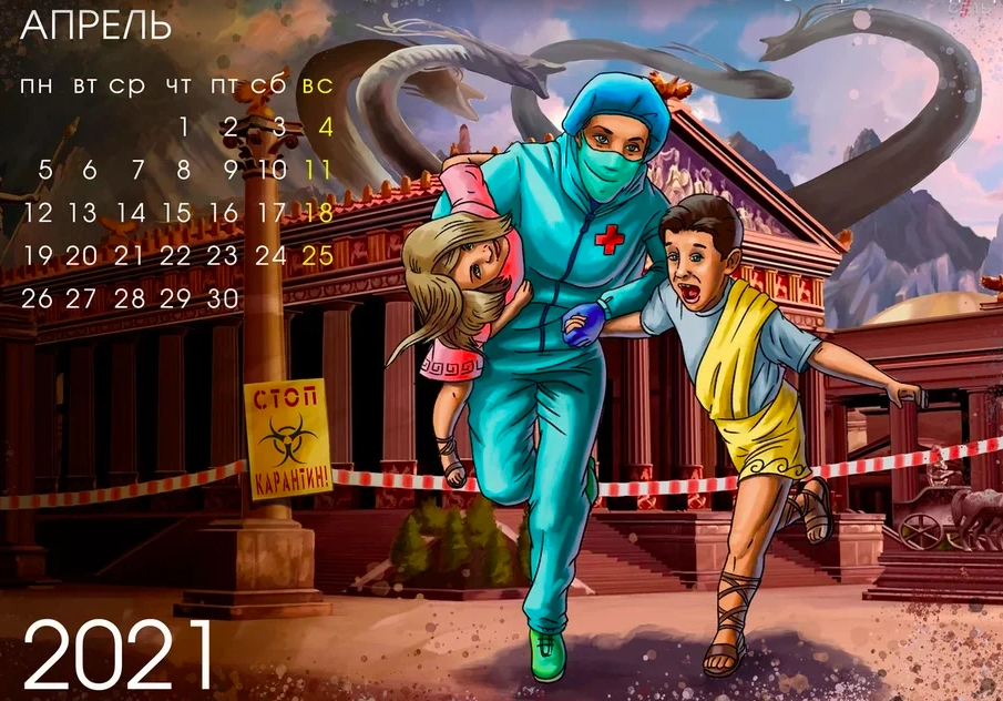 COVID-19 в календаре представлен в образах минотавра, гидры, и других монстров из легенд и античных мифов.
