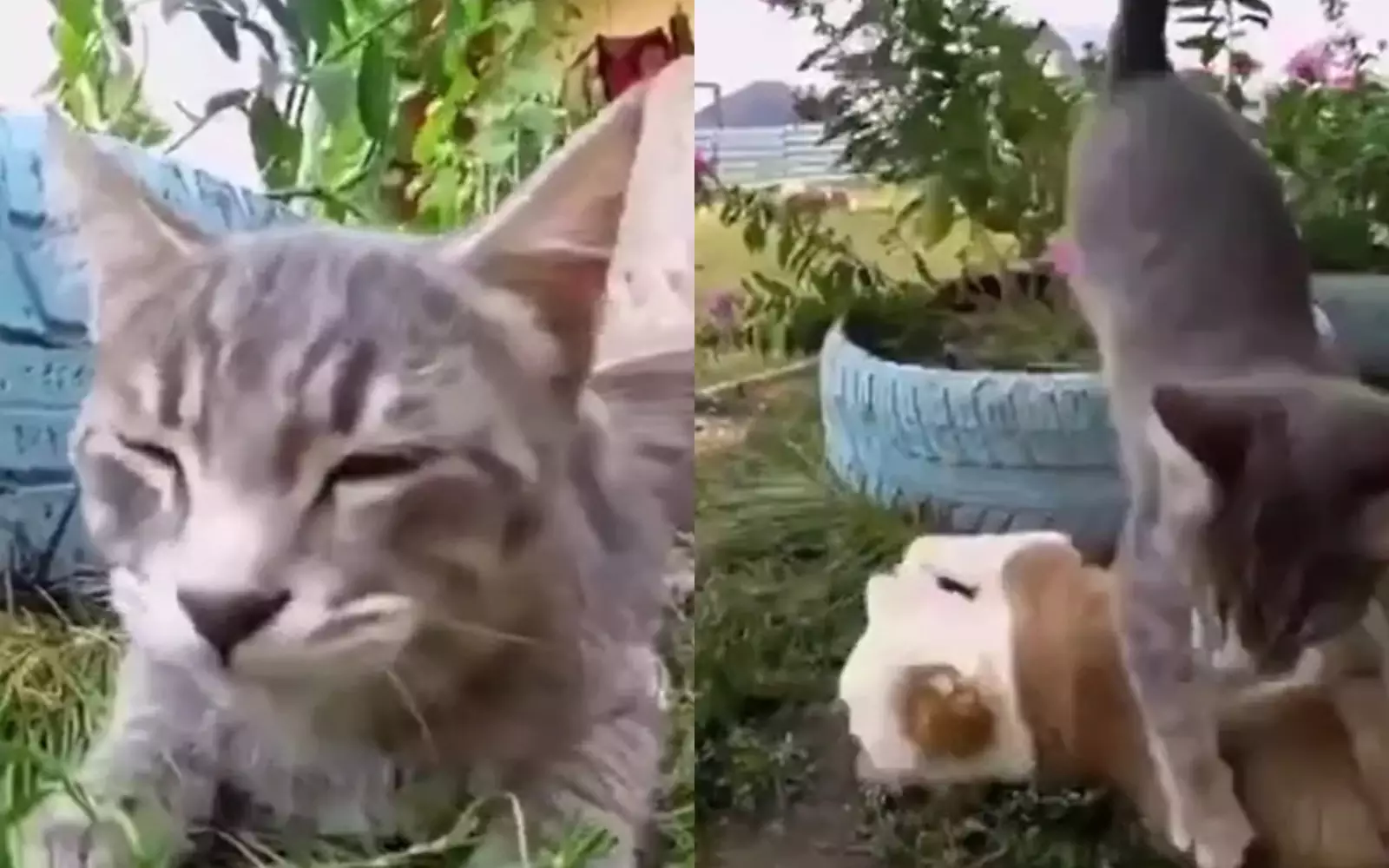 Настоящий боец: воспитанный собаками кот уверен, что он круче волкодава