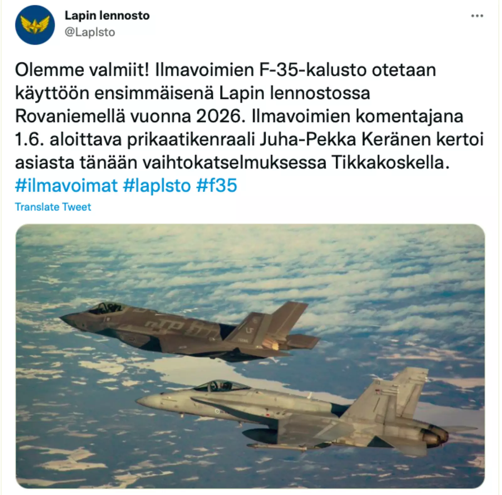 «Первые ВВС F-35 будут в первую очередь переданы Лапландскому воздушному командованию в Рованиеми в 2026 году», — заявил командующий ВВС бригадный генерал Юха-Пекка Керянен.
