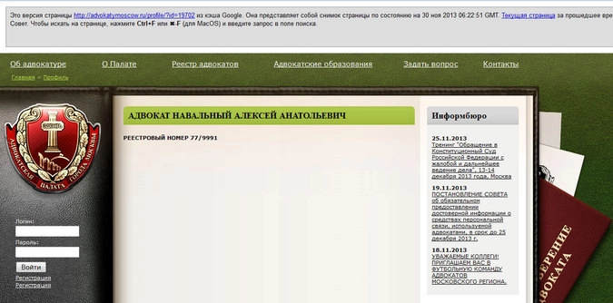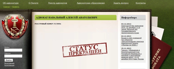 Но после запроса молодогвардейев страница была оперативно обновлена. Ныне, как сообщается на сайте, адвокатский статус Навального действительно прекращен.