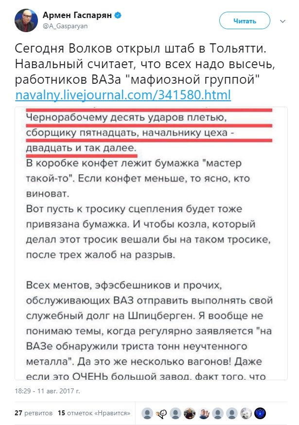 «Если мы хотим поднять русский автопром с колен… надо публично прогнать сквозь строй солдат со шпицрутенами всех инженеров и конструкторов. После чего публично высечь всех работников. Чернорабочему десять ударов плетью, сборщику пятнадцать, начальнику цеха — двадцать и так далее… Я вообще не понимаю темы, когда регулярно заявляется „на ВАЗе обнаружили триста тонн неучтённого металла“. Да это же несколько вагонов! Даже если это очень большой завод, факт того, что там могут находить вагону неучтённого металла, свидетельствует о том, что в мафиозную группу вовлечены 100% работников завода», — писал Навальный в своем блоге в 2008 году.