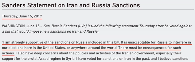 Я решительно поддерживаю санкции в отношении России, включенные в этот законопроект. Недопустимо, чтобы Россия вмешивалась в наши выборы здесь, в США, или где бы то ни было. Для таких действий должны быть последствия, — говорил Сандерс в 2017 году.