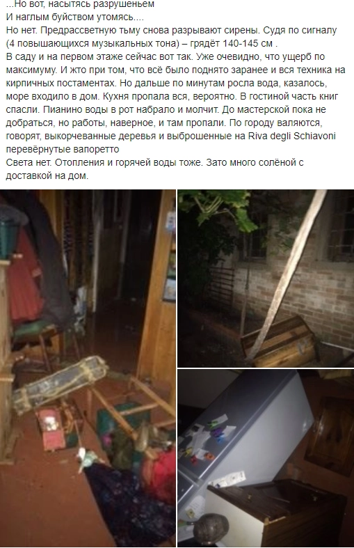 Отчасти схлынувшая вода успела нанести большой ущерб первым этажам венецианских домов. Российская художница и писательница Екатерина Марголис, проживающая в «городе карнавалов», описала состояние своего дома так:
