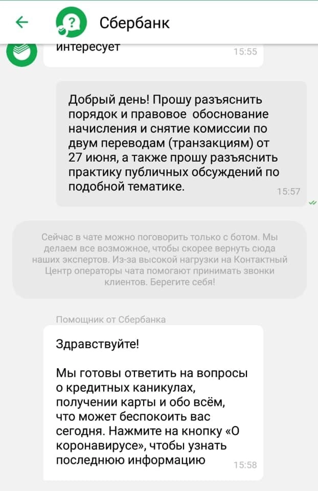«Во время самоизоляции (а для старшего поколения и ряда регионов она до сих пор не снята) уменьшение контактов с пожилыми людьми, долгое нахождение на дачах, — количество переводов, естественно, растет. А Сбербанк, существующий в большей степени за наши деньги, наживается на наших же проблемах», — заявил Кирилл Кабанов.