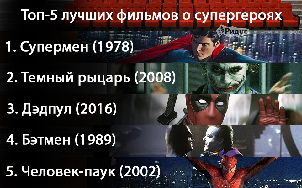 В пятерку также вошли «Бэтмен», снятый в 1989 году Тимом Бертоном, и первый «Человек-паук» с Тоби Магуайром, вышедший на экраны в 2002 году, сообщает The Independent.