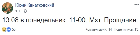 Режиссер Юрий Квятковский сообщил на своей странице в Facebook о дате и месте прощания со скончавшимся вчера известным актером и режиссером Дмитрием Брусникиным.