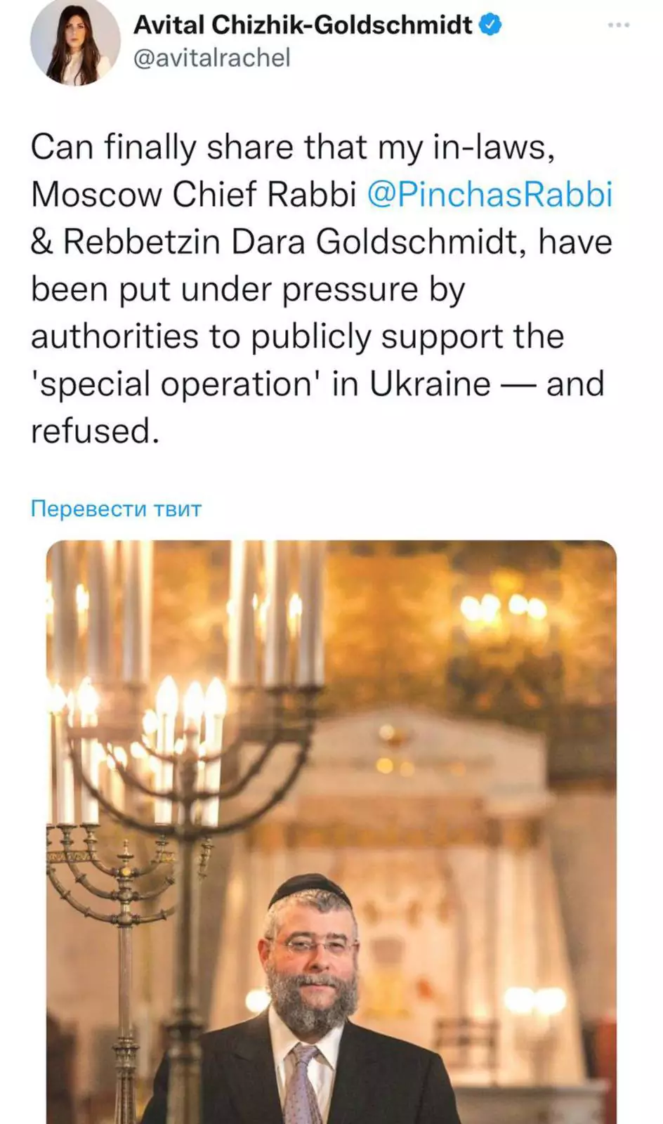 Ранее в Рунете широко разошлась новость о том, что от Гольдшмидта требовали публично поддержать военную спецоперацию на Украине. Авторы сообщений ссылались на невестку раввина.