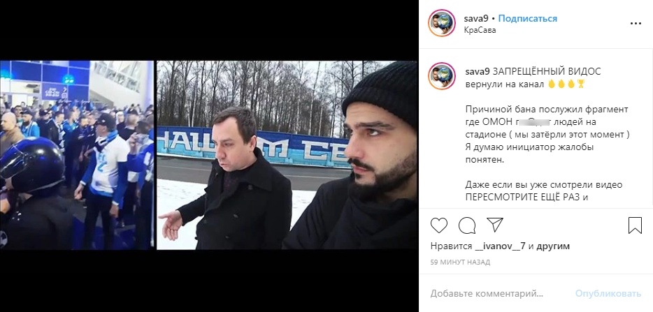Причиной бана послужил фрагмент, где ОМОН ****** людей на стадионе (мы затерли этот момент) Я думаю, инициатор жалобы понятен, — рассказал об этом Савин на личной странице в Instagram.