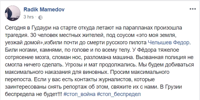 «Во время соревнований часть участников от Грузии сочла, что российский парапланерист нарушил правила и победил нечестно, и они пытались его вразумить. Тот же настаивал, что ничего не нарушал. Слово за слово, дошло до драки. Россиянин, видя, что большинство против него, сел в свою машину и уехал. Это видно и по записи видеорегистратора автомобиля. Вряд ли его там избили до полусмерти, как утверждается в посте в Фейсбуке - потому что как бы он тогда управлял машиной?»