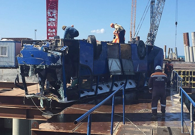 В частности, очевидцы происшествия рассказывают, что водитель автобуса пытался затормозить с помощью коробки передач, но ее разорвало на скорости. В результате автобус развернуло, он ударился о бетонный отбойник строящегося причала и рухнул в море, передает агентство.