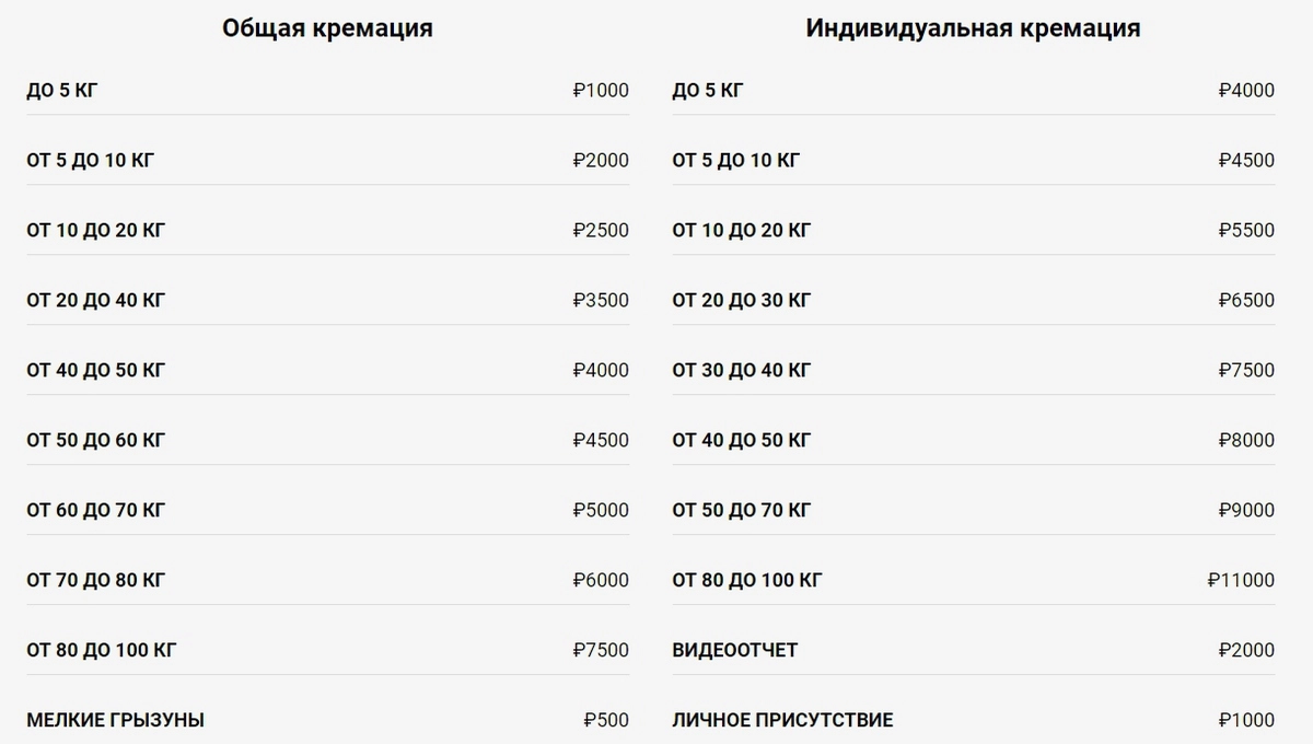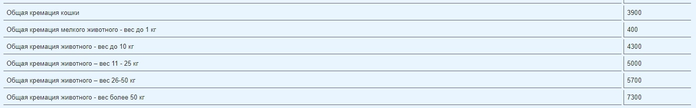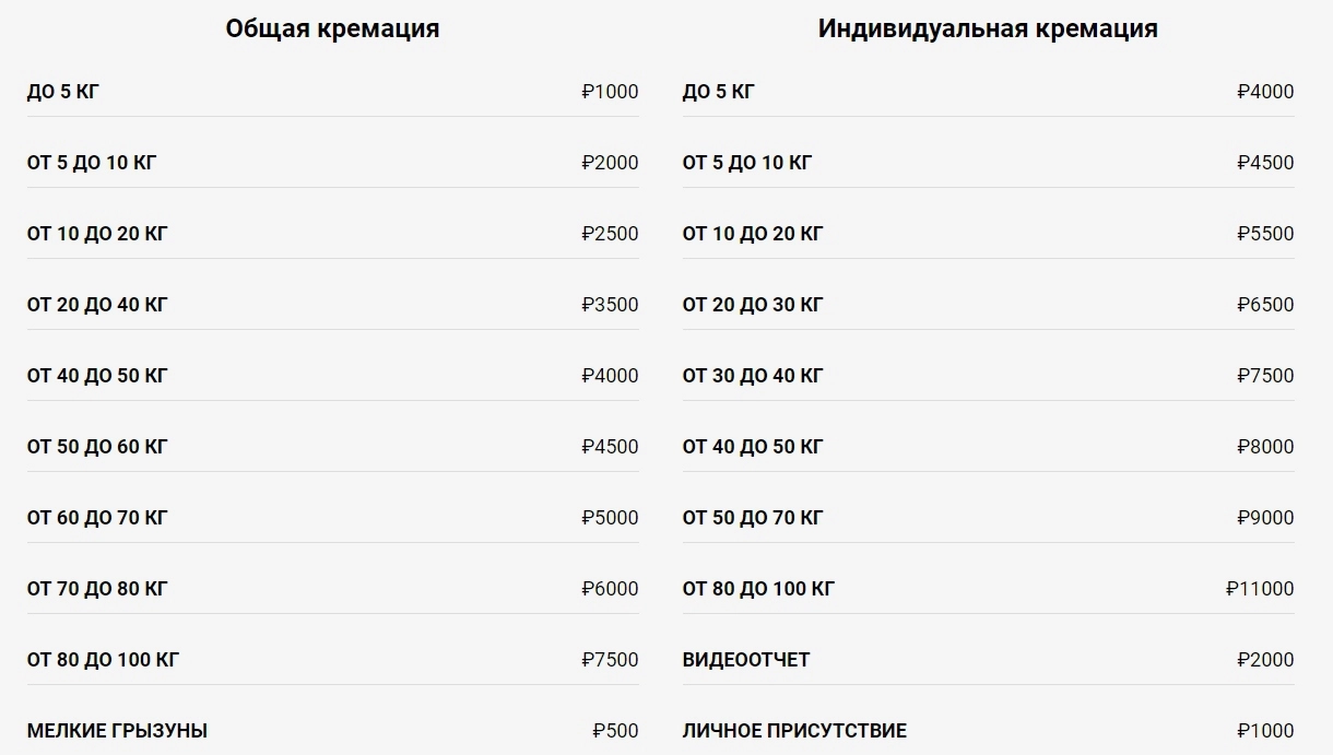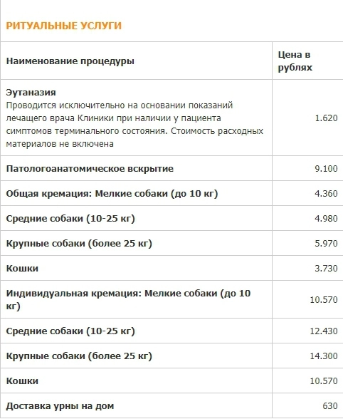 У ветеринарных клиник, которые имеют собственные крематории и работают в круглосуточном режиме, цены примерно такие же: