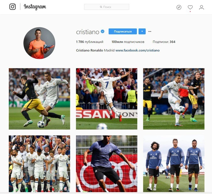 32-летний футболист Криштиану Роналду стал первым спортсменом, на которого подписались 100 миллионов подписчиков в соцсети Instagram. Об этом сообщается на иностранном портале Goal. На страничке форварда сборной Португалии и мадридского футбольного клуба «Реал» к сегодняшнему дню опубликовано 1786 фотографий, каждая из которых собирает по 2−3 млн лайков и в итоге принесла футболисту по 56,5 тысячи новых подписчиков.