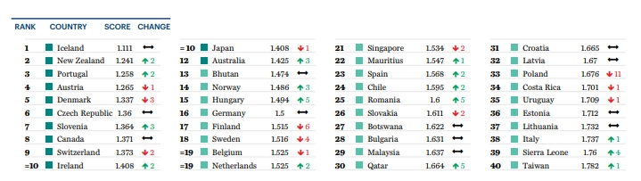 В топ-10 самых миролюбивых стран вошли Исландия, Новая Зеландия, Португалия, Австрия, Дания, Чехия, Словения, Канада, Швейцария и Ирландия.