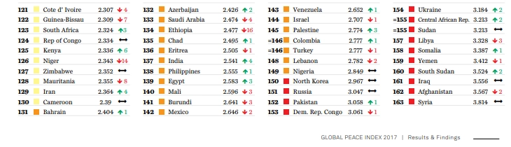 В «Глобальный индекс миролюбия», составленный экспертами из Института экономики и мира по итогам 2017 года, были включены 163 государства.