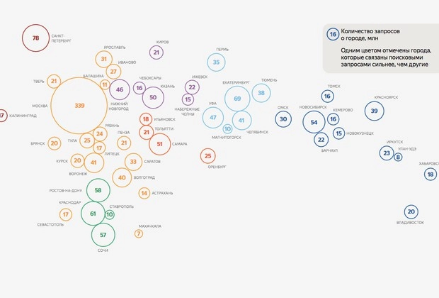 В исследовании, опубликованном на сайте компании, отмечается, что многие города запрашивают по принципу ассоциаций: в Москве пользователей интересует Кремль и работа, в Сочи — пляжи и море, в Петербурге — музеи и мосты, а в Туле — пряники и самовары.