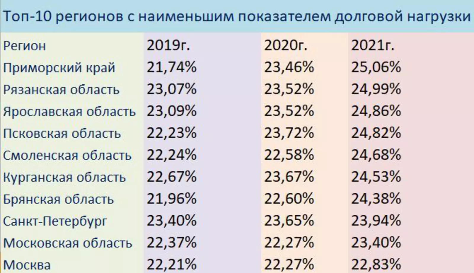 В число наименее закредитованных регионов вошли Приморский край, Санкт-Петербург, Москва и Подмосковье.