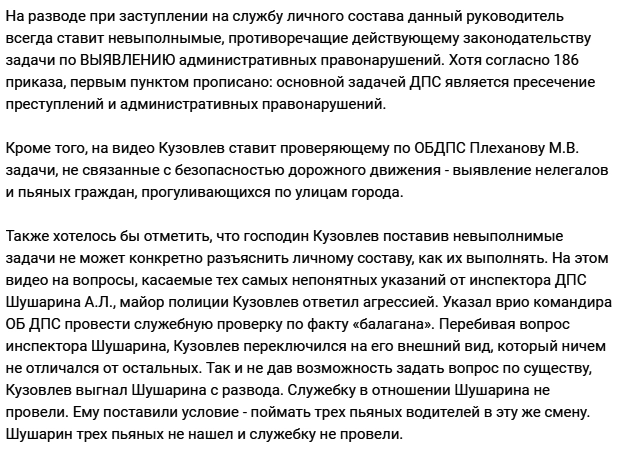 Он посоветовал подчиненым выявлять не менее 30 нарушений. «Меньше кататься нужно, больше жезлом работать», — заявил Кузовлев.