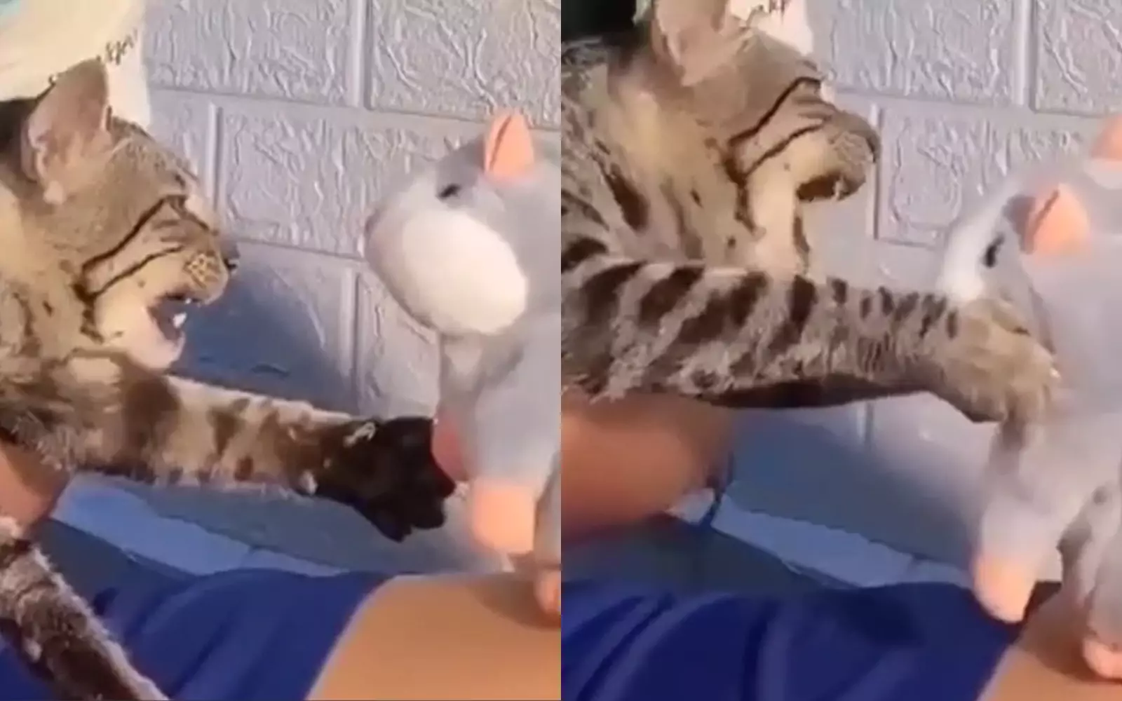 Сложно найти человека, которому нравится, когда его передразнивают. Вот и котейка из этого видео был не в восторге от игрушечного хомяка-пересмешника, который стал мяукать. Котофей пришел в ярость, когда грызун начал дразнить его, и дело чуть не дошло до драки.