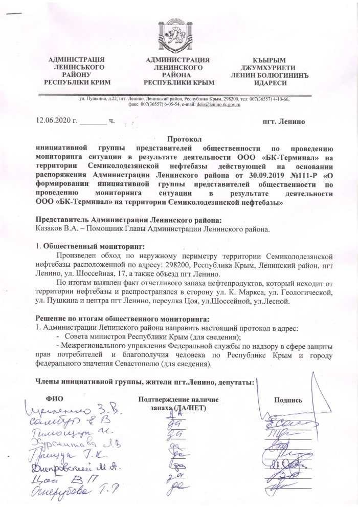 После многочисленных обращений к местным властям, так и не дождавшись исполнения обещаний Аксёнова, доведённые до отчаяния крымчане записали обращение к президенту России Владимиру Путину. Жители районного центра Ленино во всём винят бездействующих чиновников и предприятие повышенного класса опасности ООО «БК-Терминал», которое занимается перевалкой битума внутри населённого пункта.