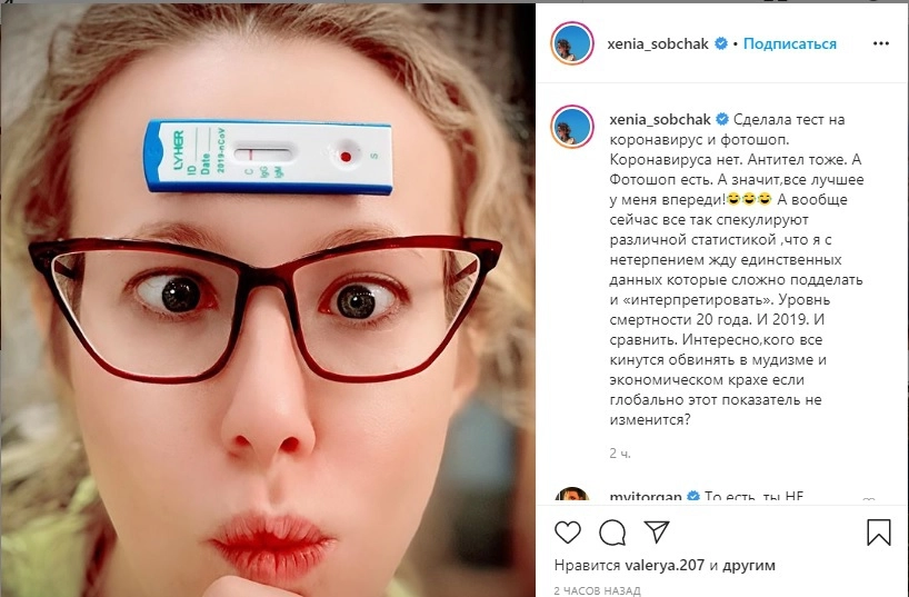 В посте от 20 апреля Собчак рассказала, что прошла тестирование на коронавирус с отрицательным результатом, и опубликовала рисунок, сделанный по этому поводу в Photoshop. Видимо, на фоне своего везения звезда усомнилась, существует ли новый вирус и пандемия на самом деле.