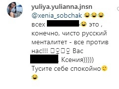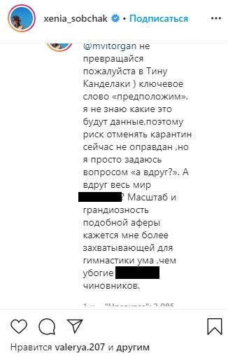 В перебранку распавшейся звездной пары по самому актуальному поводу активно включились подписчики Собчак и стали ее развивать. Одни пеняли Ксении на коронавирусное «диссидентство» и отсутствие чувства юмора. Другие попрекали Виторгана в проправительственной пропаганде, пока «народу есть нечего».