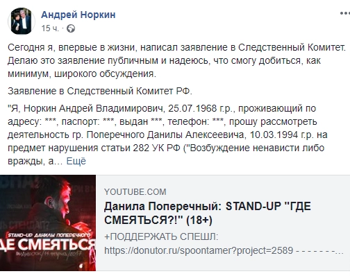 Ведущий программы «Место встречи» на НТВ Андрей Норкин подал заявление в СК на видеоблогера и стендап-комика Данилу Поперечного. Журналист просит возбудить в отношении блогера дело по статье «Возбуждение ненависти либо вражды, а равно унижение человеческого достоинства».