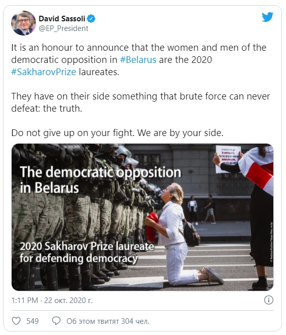 Для меня большая честь объявить, что женщины и мужчины демократической оппозиции в Белоруссии стали лауреатами премии Сахарова 2020. На их стороне то, что грубой силой невозможно победить: правда. Не сдавайтесь в своей борьбе. Мы на вашей стороне, — высказался глава Европарламента (ЕП) Давид Сассоли.
