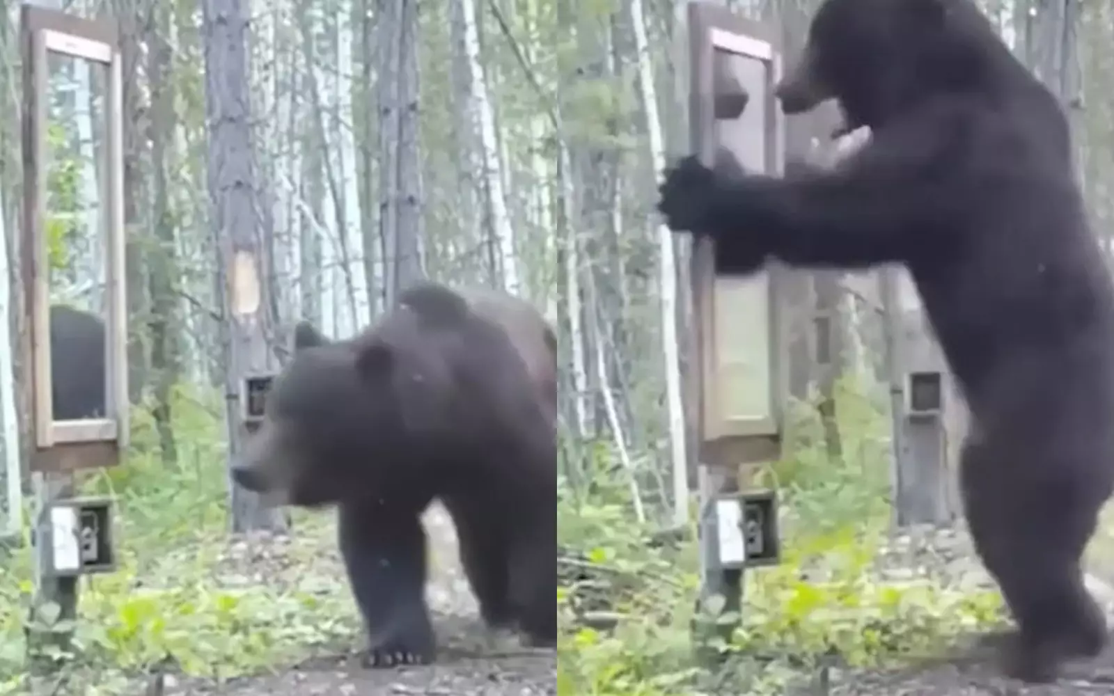 Не умылся с утра: реакция медведя на собственное отражение заставила Сеть хохотать
