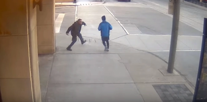 В Сети появилась видеозапись, на которой мужчина начинает нападать на случайных прохожих, идущих по улице.