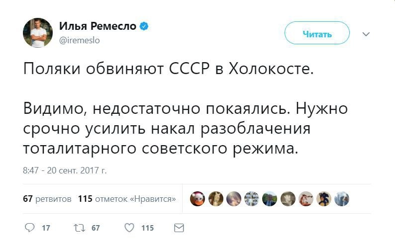 Недавно вице-министр юстиции Польши Патрик Який и депутат Сейма Ян Мосиньский потребовали от России выплаты репараций за ущерб, который советские войска нанесли полякам в годы Второй мировой войны и до нее. Незадолго до этого польский премьер Беата Шидло выступила с заявлением о том, что Польша имеет право на репарации от Германии за ущерб, нанесенный ей немецкими нацистами во время Второй мировой войны. Свою страну она назвала «жертвой войны».
