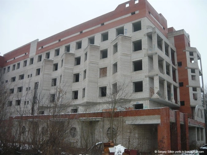 Строительство нового корпуса 1-й городской больницы было начато в 1991г. Но к концу 90-х деньги видимо кончились и в 2003 объект законсервировали. Работы на нем закончились гораздо раньше. За эти годы на объект потратили 17 млн.руб. В 2004 году, судя по сводкам местных СМИ, на объект был покупатель в лице компании "Риат". Город не смог выручить со сделки необходимую сумму и вот уже более 10 лет 6-ти этажный корпус стоит бесхозным.