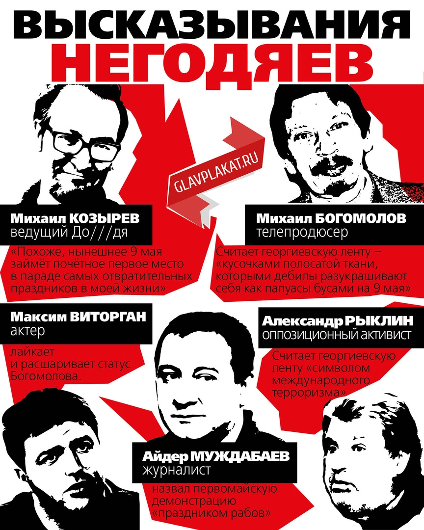 Максим Виторган, еще один «герой» баннера, получает неподдельное удовольствие, когда лайкает и расшаривает изречения Богомолова в Сети. А ведущий телеканала «Дождь» Михаил Козырев заработал себе почетное место на плакате после следующего высказывания о Дне Победы: «Похоже, нынешнее 9 мая займёт почётное первое место в параде самых отвратительных праздников в моей жизни».