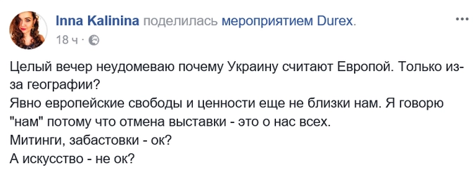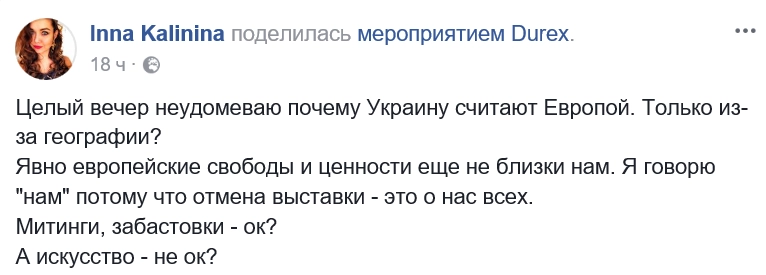 «Целый вечер недоумеваю, почему Украину считают Европой. Только из-за географии? Явно европейские свободы и ценности еще не близки нам. Я говорю «нам» потому что отмена выставки — это о нас всех. Митинги, забастовки — ок? А искусство — не ок?» — написала о сорванной выставке на своей странице в Facebook сотрудница киевского PR агентства.