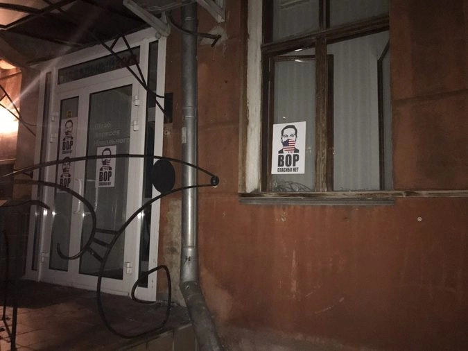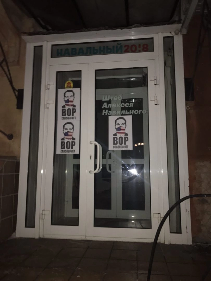 В ночь на 18 февраля на здании так называемого предвыборного штаба Алексея Навального появились наклейки с изображением блогера и надписью «Вор. Спасибо, нет».