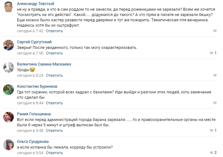 Сургутские полицейские устанавливают личности неизвестных, зарезавших барана прямо у входа в местный перинатальный центр. Невольными свидетелями инцидента оказались пациентки и персонал медицинского учреждения, пишет URA.RU.