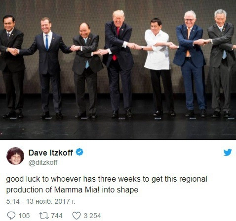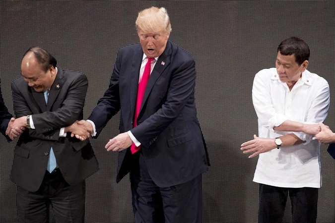 Во время групповой фотосессии на церемонии открытия саммита диктор объявил, что «сейчас будет рукопожатие АСЕАН». Американский лидер скрестил руки перед собой, по всей видимости не сразу поняв, что нужно сцепиться ладонями с обоими своими соседями — филиппинским президентом Родриго Дутерте с одной стороны и главой Вьетнама Чан Дай Куангой с другой.