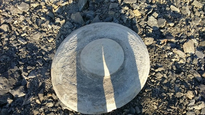Рабочие Моховского угольного разреза в Кузбассе обнаружили в земле необычный камень в форме диска — диаметром около метра, выпуклый с обеих сторон, полностью каменный.