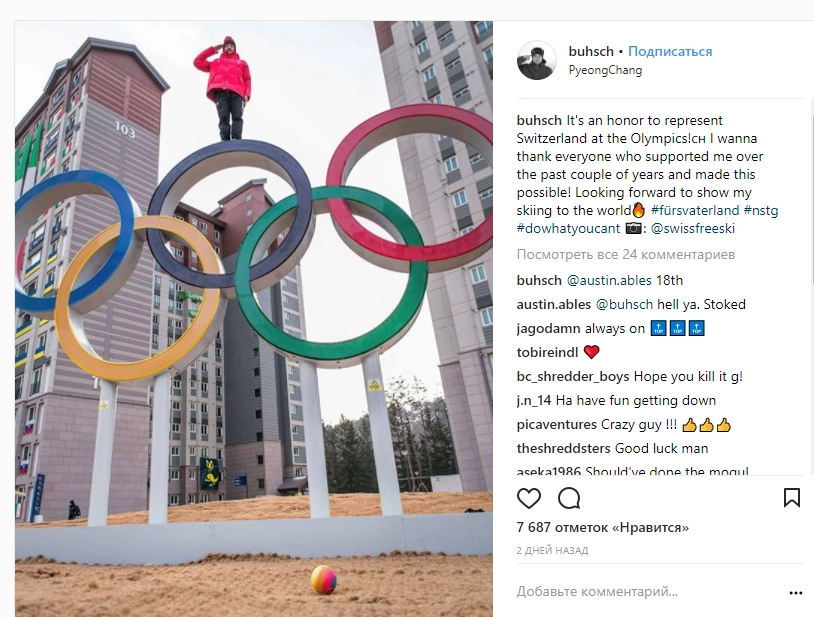 Бош, приехавший в Пхёнчхан для выступлений в лыжном фристайле в дисциплине слоупстайл, также сфотографировался в строевой стойке, забравшись на огромные олимпийские кольца.