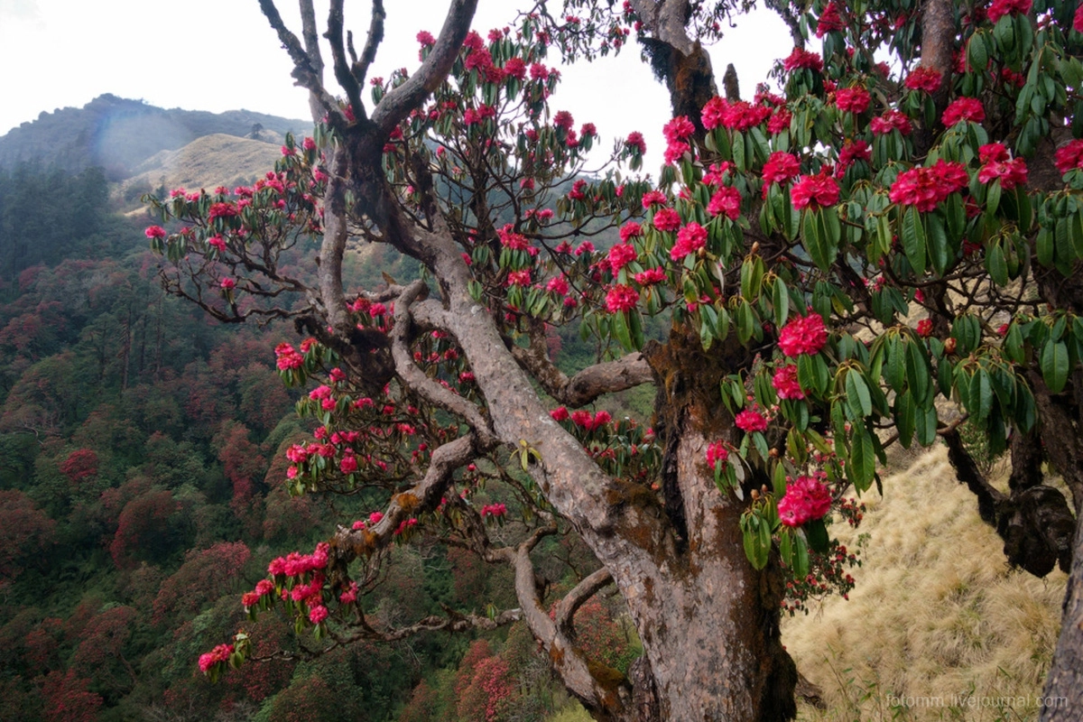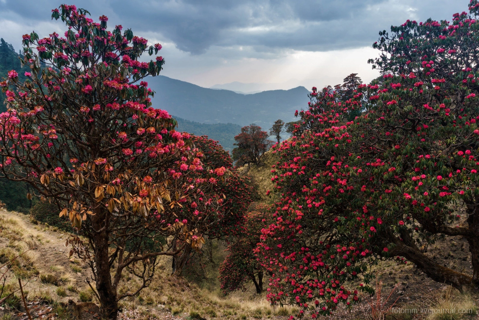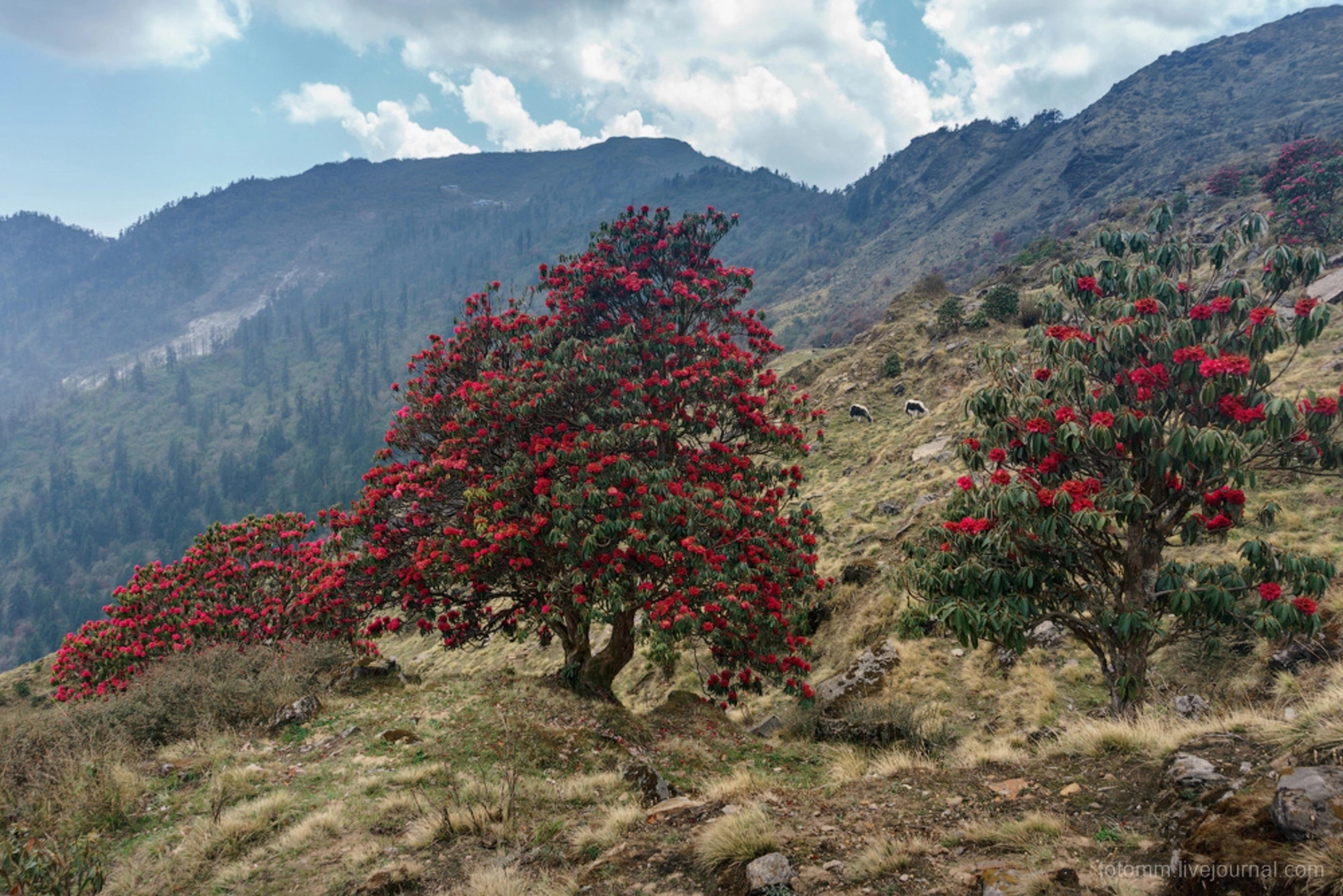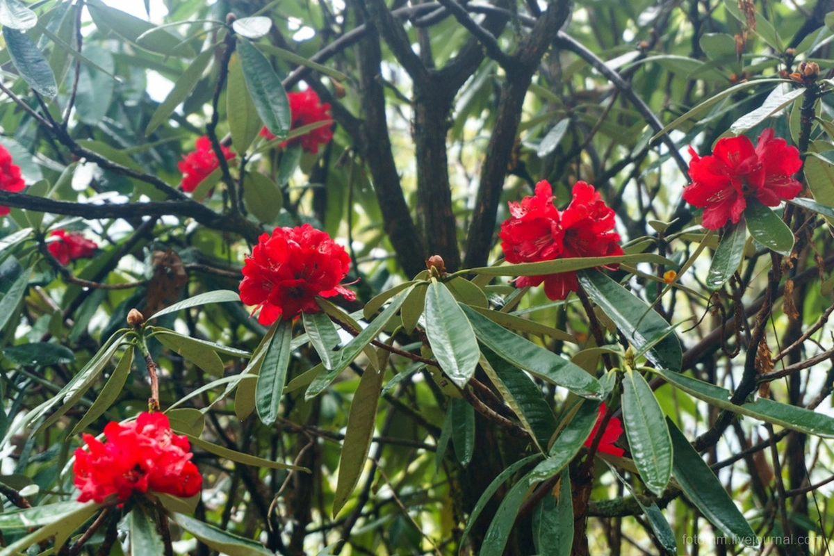 Больше всего меня поразили вот эти райские кущи — склоны гор, местами почти сплошь покрытые яркими цветами лалигурасов ! Все оттенки красного, а порой даже лилового и фиолетового. А ведь окажись я здесь на две недели позже, и вряд ли бы это увидел, период их цветения уже заканчивался.