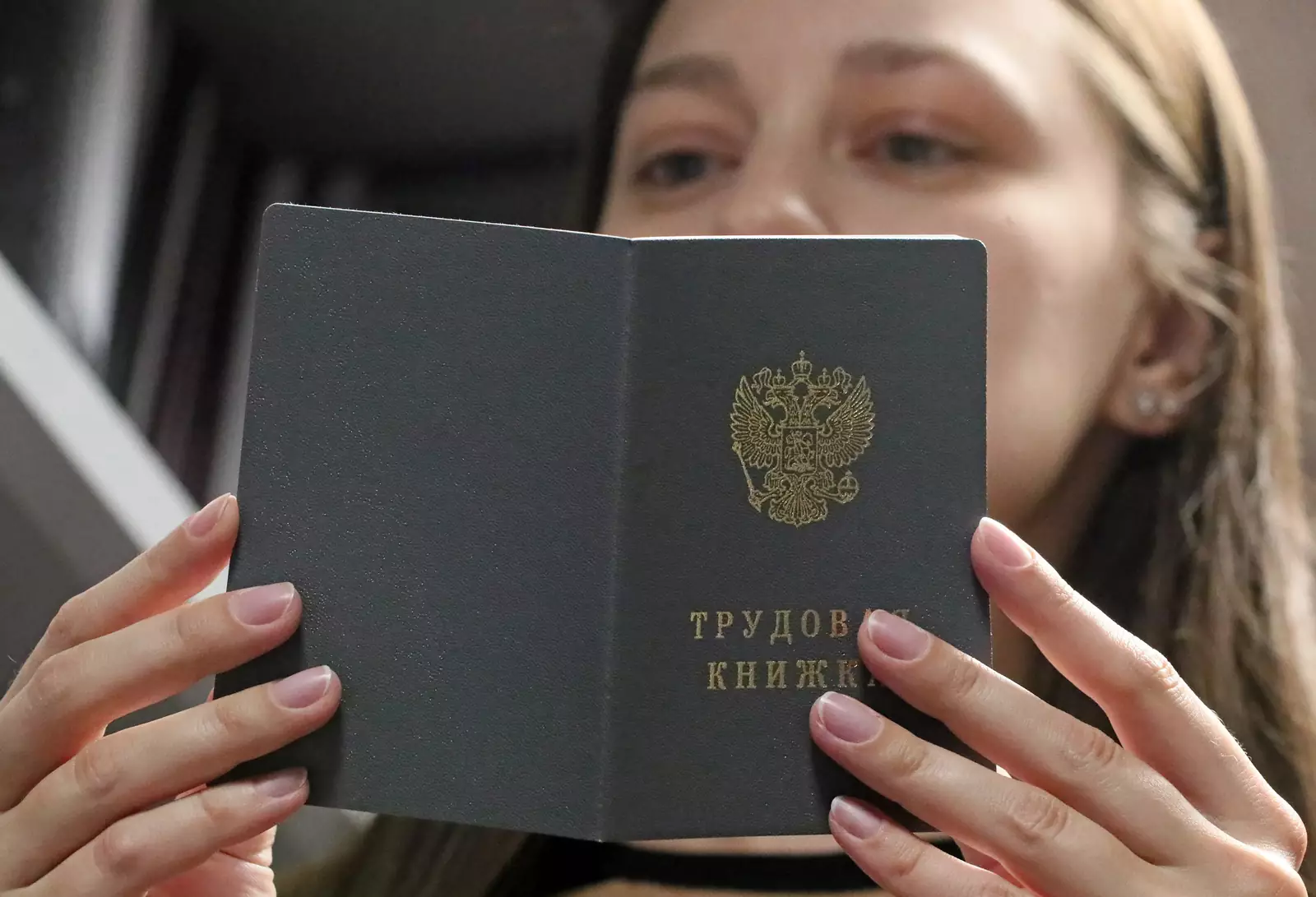 Девушка изучает трудовую книжку