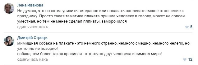 В социальных сетях отметили, что собаки тоже воевали «не такие, но все же», и вообще «пусть там [на плакатах] хоть реклама Икеи будет, главное, чтоб от души», — решили пользователи.
