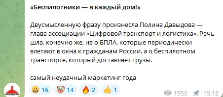 Хотя речь на форуме шла о доставках вполне мирных грузов, в контексте специальной военной операции и регулярных налётов украинских боевых дронов лозунг Давыдовой прозвучал для комментаторов из Рунета угрожающе. Пользователи Сети быстро поставили это директору ассоциации на вид.