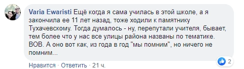 «Акция приурочена к 9 мая. Это был ближайший памятник территориально, и они решили возложить цветы Тухачевскому. Давайте расценивать это как дань уважения военачальнику. Дети, живущие в этом микрорайоне, обязаны знать людей, в честь которых названа улица и установлен памятник, это самое главное, однозначно», — цитирует представителя школы радиостанции «Говорит Москва».