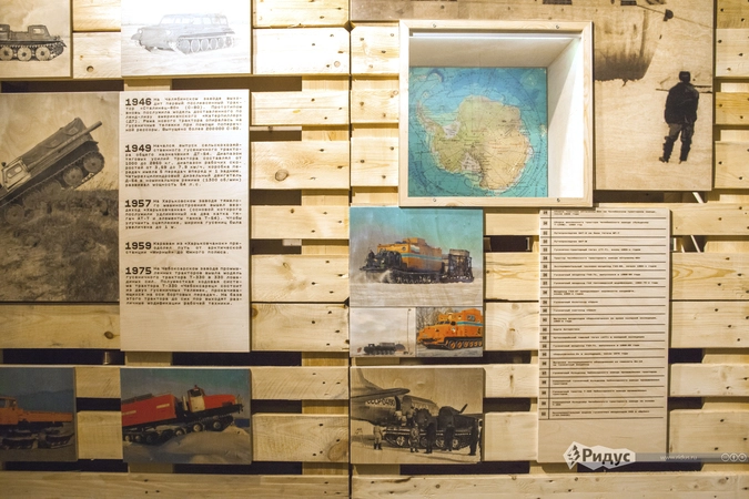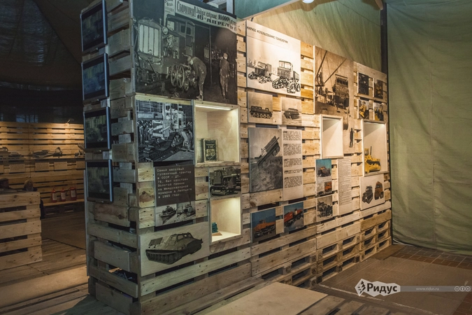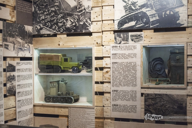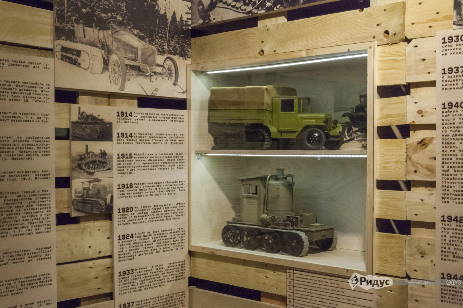 Первый раздел посвящен гусеничному движителю. В 1877 году изобретатель-самоучка Федор Блинов придумал вагон на гусеничном ходу для перевозки грузов по шоссейным и проселочным дорогам. Спустя много лет изобретение легло в основу самого известного танка военного времени — Т-34.
