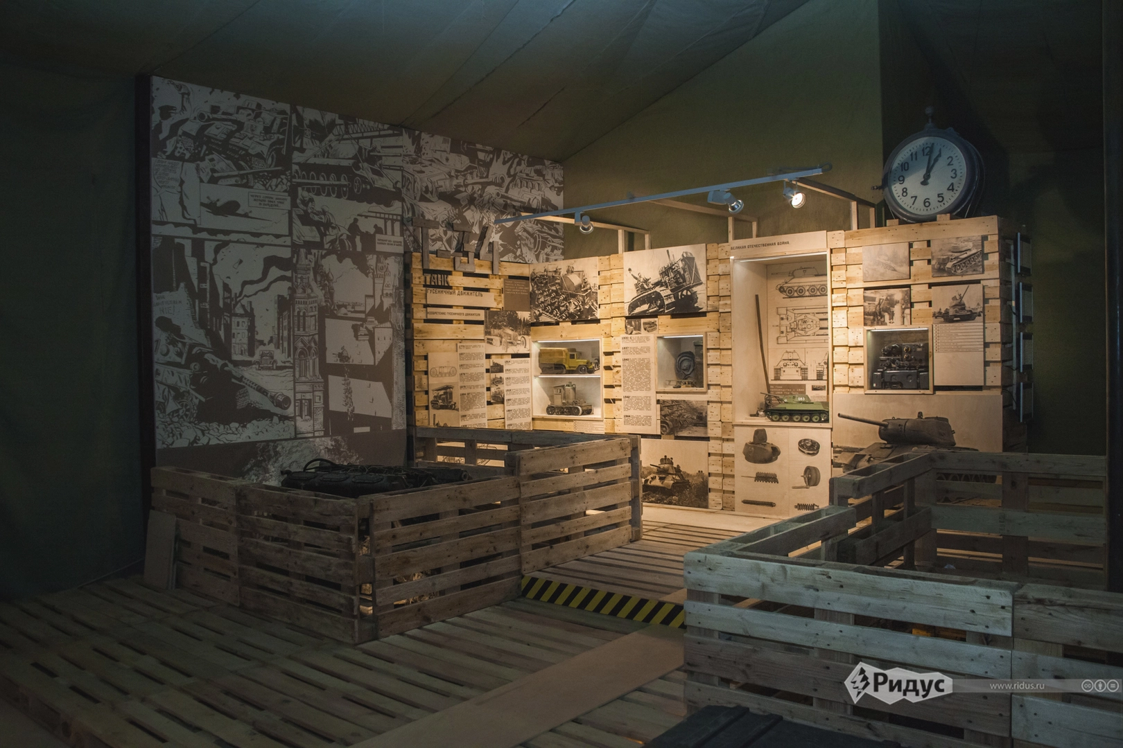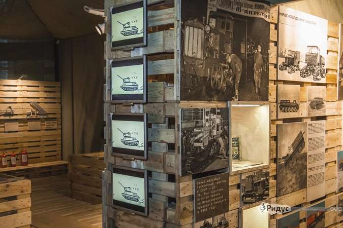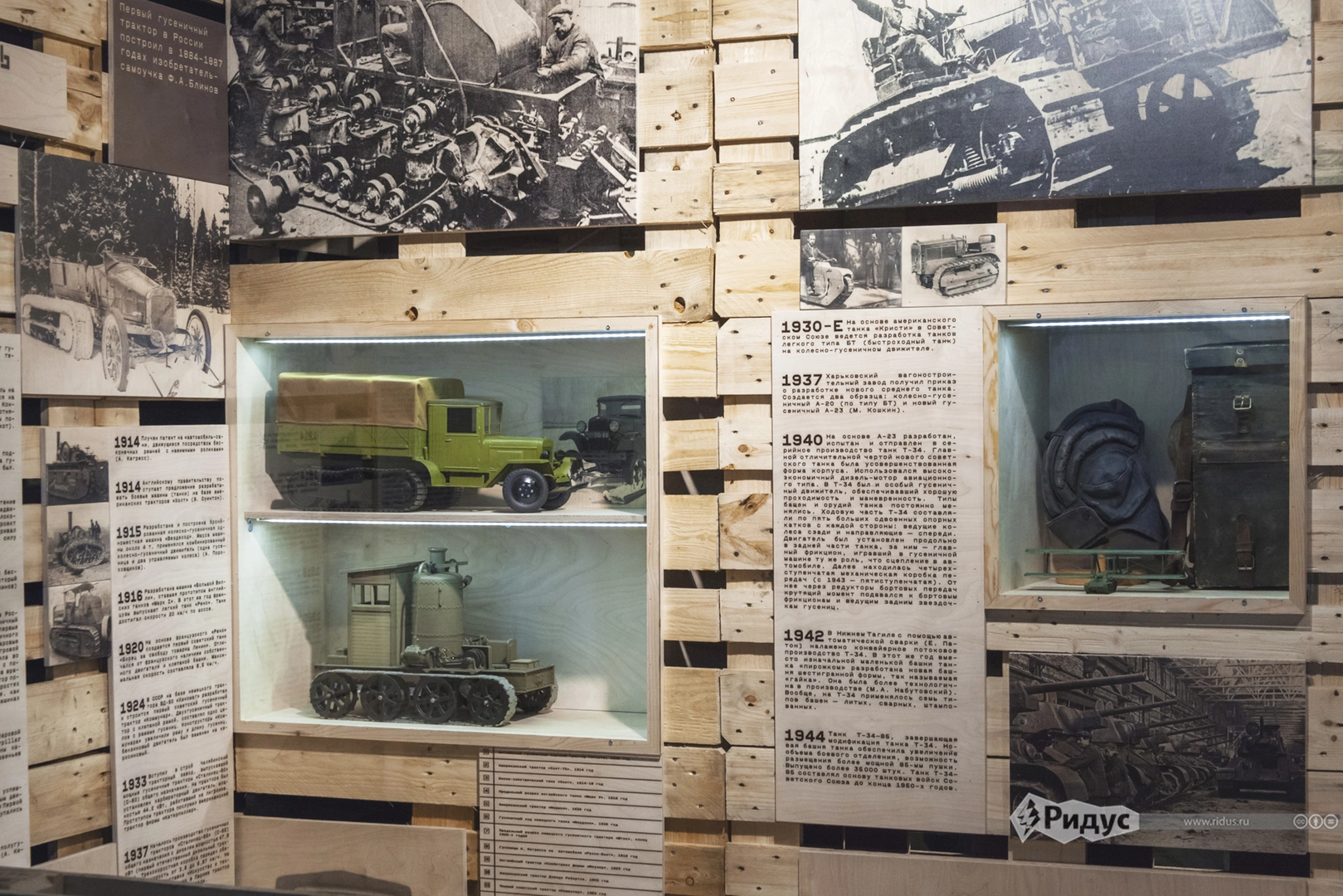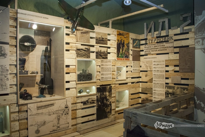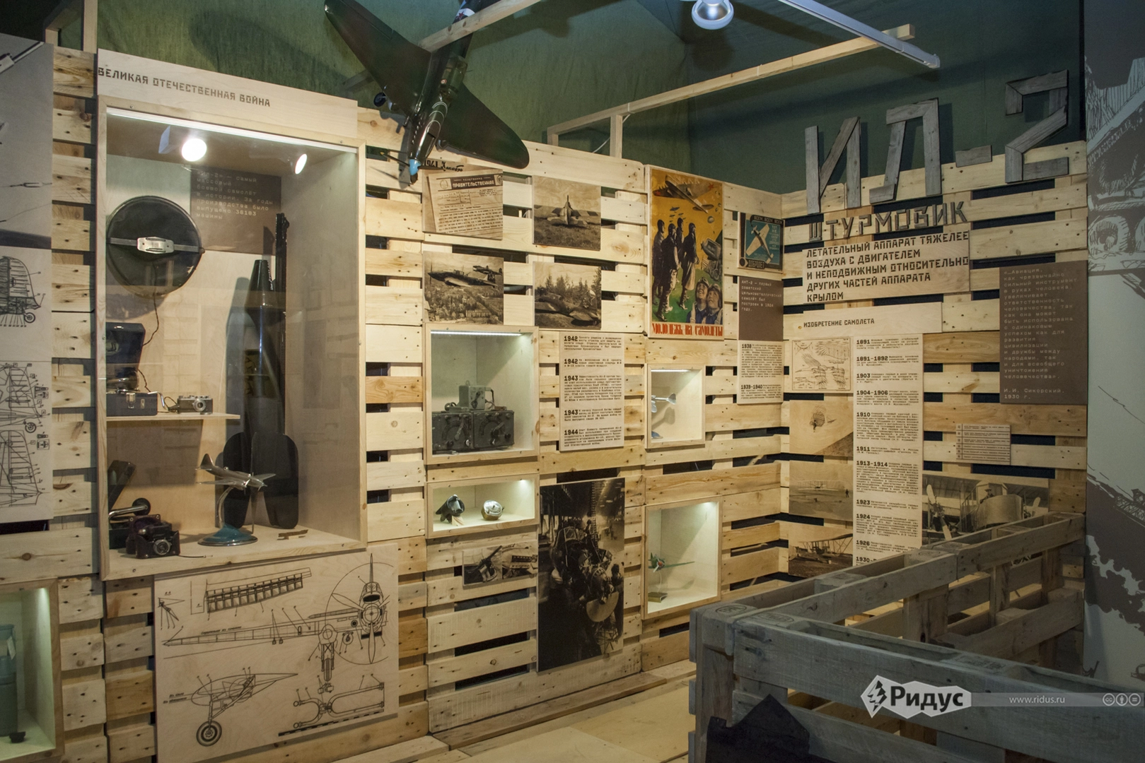 В экспозиции три центральных объекта: гусеничный движитель Федора Блинова, самолет ИЛ Сергея Ильюшина и реактивный двигатель, использовавшийся во время Великой Отечественной в установке «Катюша».